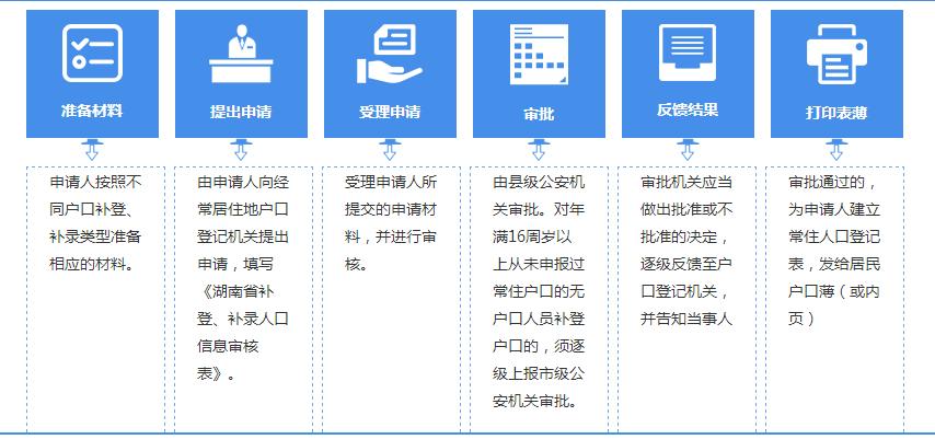 1、年满1周岁人员从未登记过户口的:本人或者其监护人可以凭《出生医学证明》和父母一方的居民户口簿、结婚证或非婚生育说明,向本人居住地或监护人户口所在地公安派出所申报户口补登,并接受民警与补登人员或其监护人的见面谈话调查,形成调查材料。未办理《出生医学证明》的,本人或者其监护人可以按照《湖南省常住户口登记管理办法》第十三条第一款所列的申领《出生医学证明》的情形,向有关机构申领《出生医学证明》。非婚生育人员随父落户的,需一并提供具有资质的鉴定机构出具的亲子鉴定证明。对因不符合签发条件未获得《出生医学证明》的人员,可凭具有资质鉴定机构出具的亲子鉴定证明,或者经公安机关调查核实的接生证明、村(居)委会证明等相关证明,或者公安机关的调查核实材料为其办理户口补登