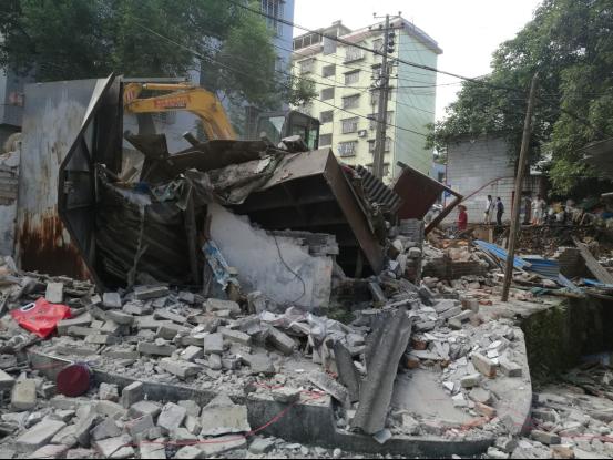 陈家湾社区辖区单位珠洲机务段郴州运用车间职工老食堂多年来未使用,房屋破损又无法拆除,严重影响市容市貌和过往市民的安全;郴州自创建以来,苏仙岭街道党工委和陈家湾社区居民委员会多方以铁路部门协调,但由于铁路部门要拆除原有房屋也要向上级请示申报;2018年7月17日-18日随着挖掘机的轰鸣声这栋失修已久的职工老食堂终于拆除。拆除后解决了过往行人的安全、道路也宽畅了很多,同时拆除后闲置的地也可用于停车场、居民休闲、绿化、健身场地等。